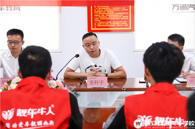 靚車牛人汽車美容連鎖龍總在講話中對(duì)西安萬通校企合作的教學(xué)方式表示贊賞,并肯定了萬通學(xué)子專業(yè)的職業(yè)技術(shù)和高尚的道德修養(yǎng),未來將與西安萬通深化校企合作,共育精英人才!