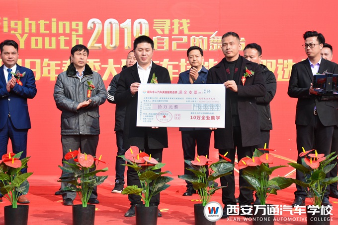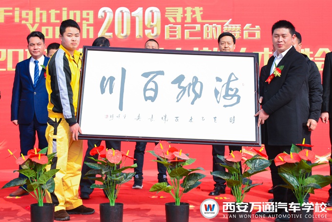 接下來,西安萬通畢業生代表懷著對未來滿滿的期待上臺發言,并代表2019屆畢業學子向即將別離的母校贈送了一塊包含深情的牌匾;企業代表對此次雙選會的主辦方、承辦方表達了謝意,并指出企業發展與職業教育之間的密切紐帶與重要作用。并且,行業內知名企業恒泰、百順、卡爾、靚車牛人、一番車道在開幕式上為西安萬通贈送了“企業助學金”,以期西安萬通能為社會、企業培養更多的汽車技能人才。