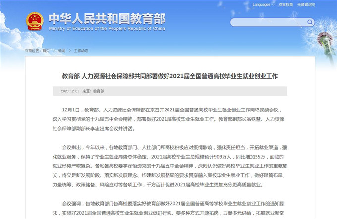 12月1日,教育部、人力資源社會保障部在京召開2021屆全國普通高校畢業生就業創業工作網絡視頻會議。會議指出2021屆高校畢業生總規模預計909萬人,同比增加35萬,再創歷史新高!畢業生面臨的就業形勢嚴峻復雜。這也是我國高校畢業生人數首次突破900萬大關。