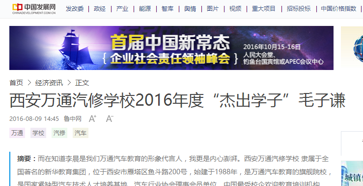【中國發展網】萬通汽車教育2016年度“杰出學子”毛子謙
