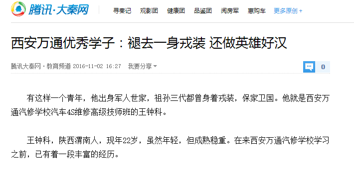 有這樣一個青年,他出身軍人世家,祖孫三代都曾身著戎裝,保家衛(wèi)國。他就是西安萬通汽修學(xué)校汽車4S維修專業(yè)技師班的王鐘科。