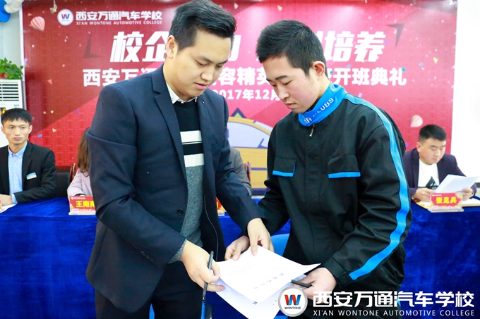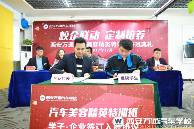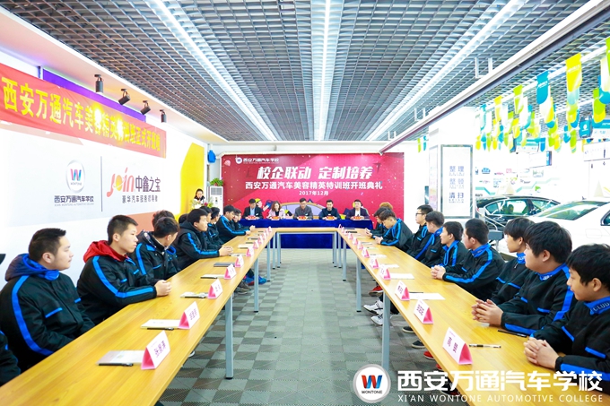12月1日,校企雙方的相關(guān)領(lǐng)導共同出席了西安萬通“汽車美容精英特訓班”的開班典禮,來見證這個新的校企合作班的成立與發(fā)展,在典禮上24名學子挺身正坐,精神抖擻。