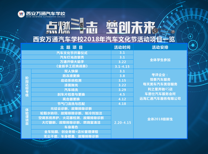 大地回春,盎然生機(jī),西安萬(wàn)通汽車學(xué)校也是一片欣欣向榮,一年一度的汽車文化節(jié)又如期而至。2018年3月1日,西安萬(wàn)通隆重舉行了汽車文化節(jié)開幕式,作為年度盛事,本屆文化節(jié)以“點(diǎn)燃斗志 夢(mèng)創(chuàng)未來(lái)”為主題,為學(xué)子生們提供了充分展示青春活力的舞臺(tái)。