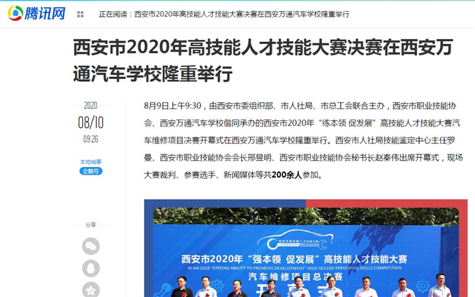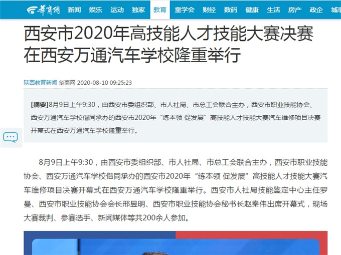 8月9日上午9:30,由西安市委組織部、市人社局、市總工會聯合主辦,西安市職業技能協會、西安萬通汽車學校偕同承辦的西安市2020年“練本領 促發展”高技能人才技能大賽汽車維修項目決賽開幕式在西安萬通汽車學校隆重舉行,引起了社會的廣泛關注,更是掀起了媒體報道的熱潮。騰訊網、華商網、華商頭條等多家權威媒體對此次活動進行了實時報道。
