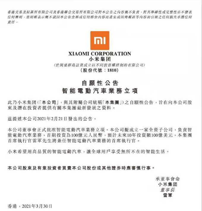 3月30日,小米集團在港交所發布公告,正式宣布進入造車領域。小米在公告中表示,擬成立一家全資子公司,負責智能電動汽車業務。首期投資為100億元人民幣,預計未來10年投資額100億美元。小米還稱,小米CEO雷軍將兼任智能電動汽車業務的首席執行官。