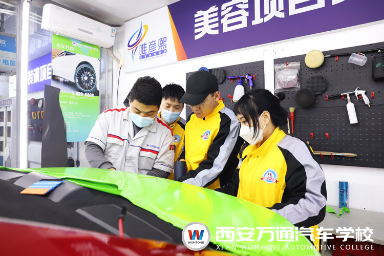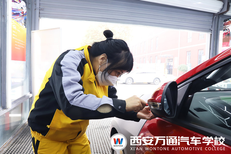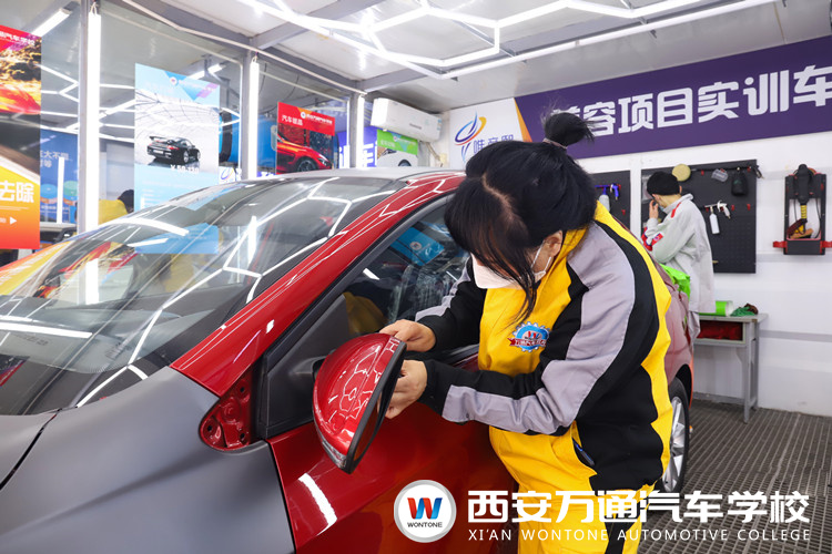 “汽修行業不只是男性的天下,女性也可以做的很好。”楊存莉面對鏡頭,自信地說。汽車美容實訓室里,楊存莉正在專心致志進行貼膜練習,張軍利老師在一旁耐心指導,直到看到她動作規范標準,才放心去看另一邊的學子。來西安萬通已經有半個月時間,這是她每天都在經歷的實訓課。