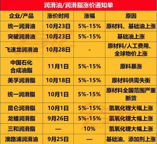 在10月底時,就已經有多家潤滑油企業宣布漲價,包括統一潤滑油、突破潤滑油、飛速龍潤滑油等企業,漲價到11月!潤滑油為什么瘋漲?根據這些漲價通知單,提到的漲價原因主要為基礎油、氫氧化鋰等原材料上漲。