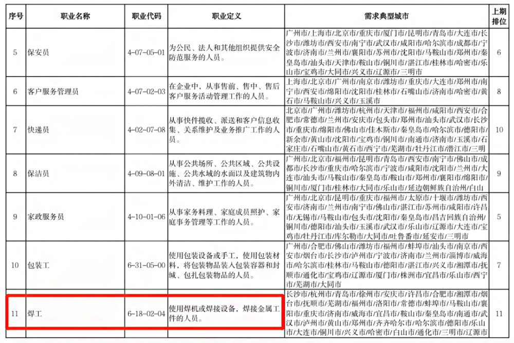 近期,人社部公布『2022年第一季度全國(guó)招聘大于求職“最缺工”的100個(gè)職業(yè)排行』,“焊工”高居短缺行業(yè)排名第11名。