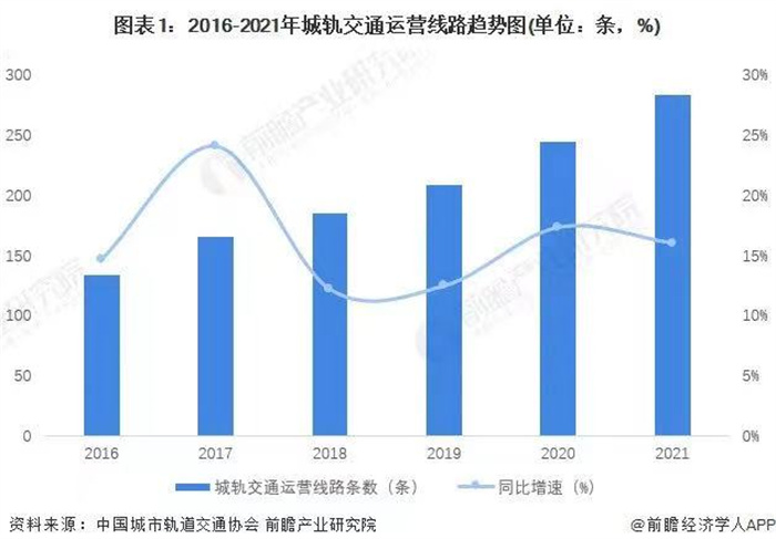 近年來,城軌交通運營線路呈上升趨勢,按照每年超過10%的增速快速增長。根據中國城市軌道交通協會發布的《2021年中國內地城軌交通線路概況》數據顯示,2021年我國新增城市軌道交通運營線路39條,累計達到283條。