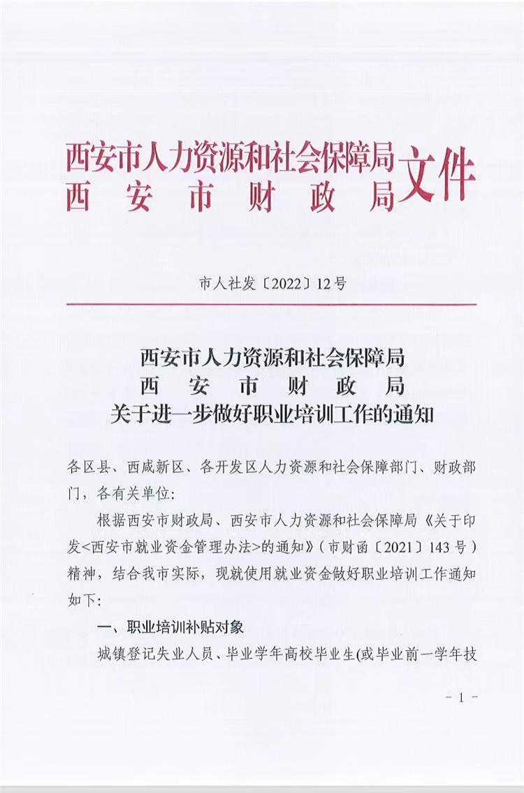 近日 西安市財政局、西安市人力資源和社會保障局印發 《關于進一步做好職業培訓工作的通知》(以下簡稱(通知))并且要求各個區縣認真貫徹落實。