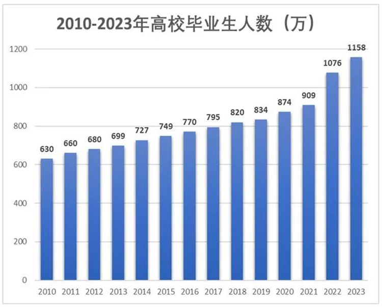 2023年全國(guó)共有1291萬(wàn)人報(bào)名高考,比去年增加98萬(wàn)人,再創(chuàng)歷史新高。同樣的,高校畢業(yè)生人數(shù)也逐年創(chuàng)新。據(jù)相關(guān)數(shù)據(jù)統(tǒng)計(jì),2023年畢業(yè)生預(yù)計(jì)可達(dá)1158萬(wàn)人。畢業(yè)人數(shù)創(chuàng)下了歷史高峰,而用人單位能提供的崗位卻依舊少的可憐。高校畢業(yè)生面臨著“畢業(yè)即失業(yè)”的巨大困境。