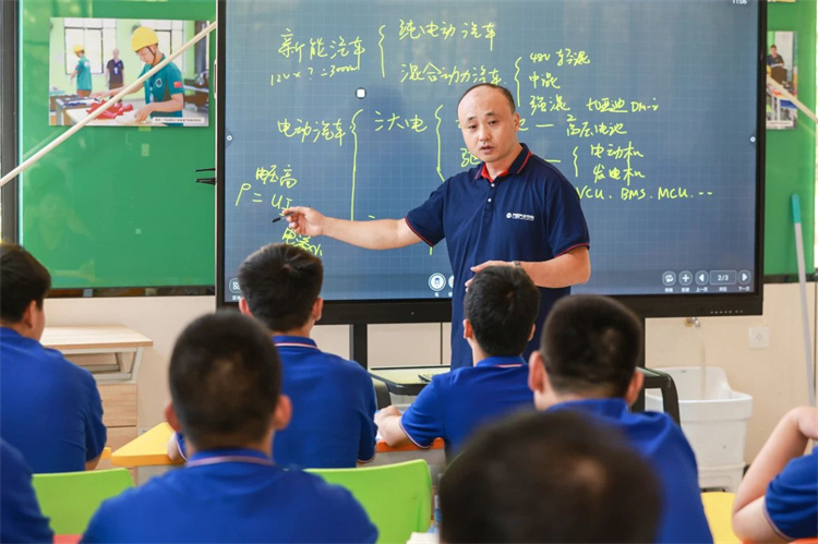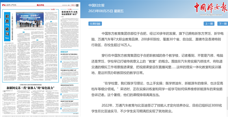 一、職業(yè)教育怎么教, 才能適應(yīng)智能制造發(fā)展的需求? 萬通汽車教育作為中國(guó)東方教育集團(tuán)旗下汽車職教品牌,經(jīng)過30多年的發(fā)展沉淀,已在全國(guó)布局39所院校,常年在校生6萬人。 穿行在萬通的教學(xué)樓,學(xué)校早已打破傳統(tǒng)意義上的“教室”的概念,圍攏在汽車旁實(shí)操汽修技術(shù)、將軌道交通的模擬工作場(chǎng)景搬進(jìn)課堂、把視頻課堂設(shè)在直播間里……這樣的理實(shí)一體化教室和實(shí)訓(xùn)基地,是萬通汽車學(xué)校的教學(xué)日常。 “在學(xué)校里,我們既學(xué)習(xí)理論,也上手實(shí)操;既學(xué)燃油車、新能源車的維保,也涉足高檔車等細(xì)分領(lǐng)域。”正在實(shí)操訓(xùn)練室和同學(xué)一起學(xué)習(xí)如何保養(yǎng)維修新能源車的束俊鵬這樣說。這個(gè)暑假,他們的課程排得滿滿當(dāng)當(dāng)。 2015年前后,萬通汽車的全國(guó)院校就陸續(xù)開設(shè)了新能源專業(yè);5年前,智能網(wǎng)聯(lián)汽車專業(yè)正式招生;2022年,萬通汽車教育與比亞迪簽訂了技能人才定向培養(yǎng)協(xié)議,目前已組織近3000名學(xué)生在比亞迪實(shí)習(xí),不少學(xué)生實(shí)習(xí)期滿后實(shí)現(xiàn)了就地就業(yè)。 無論是實(shí)訓(xùn)設(shè)備、教學(xué)模式、產(chǎn)教融合、就業(yè)創(chuàng)業(yè)……萬通始終走在前列。